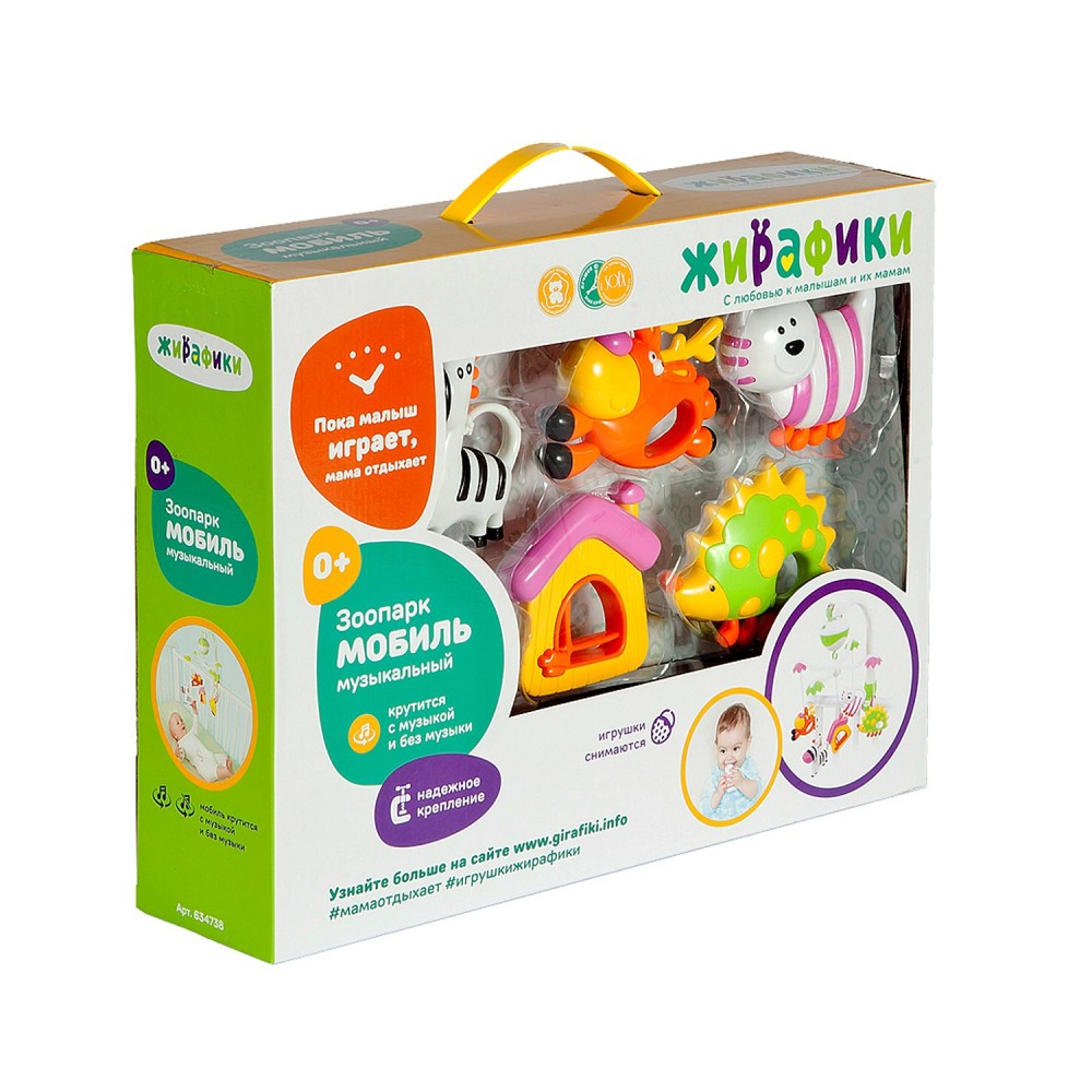 Жирафики.634738 Мобиль э/ф "Зоопарк" 2 режима, музыка, 5 съем. игрушек, бат. не вх. в компл.