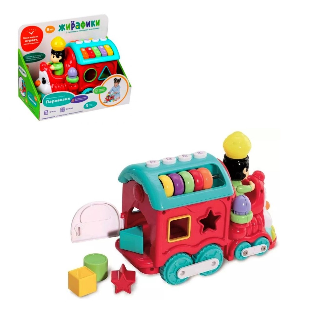 Жирафики.691196 Игрушка э/ф "Паровозик" ездит, сортер, счеты, свет/мелодии/звуки, эл.пит.