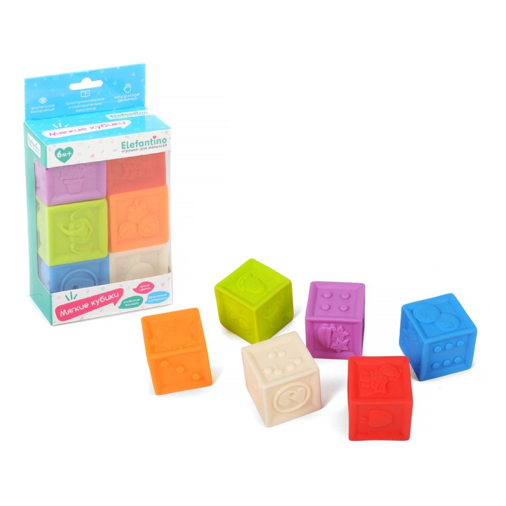 Elefantino. Мягкие кубики 6 шт. с выпуклыми элементами яркие цвета, в/к 11*6,4*16 см. арт.IT106447