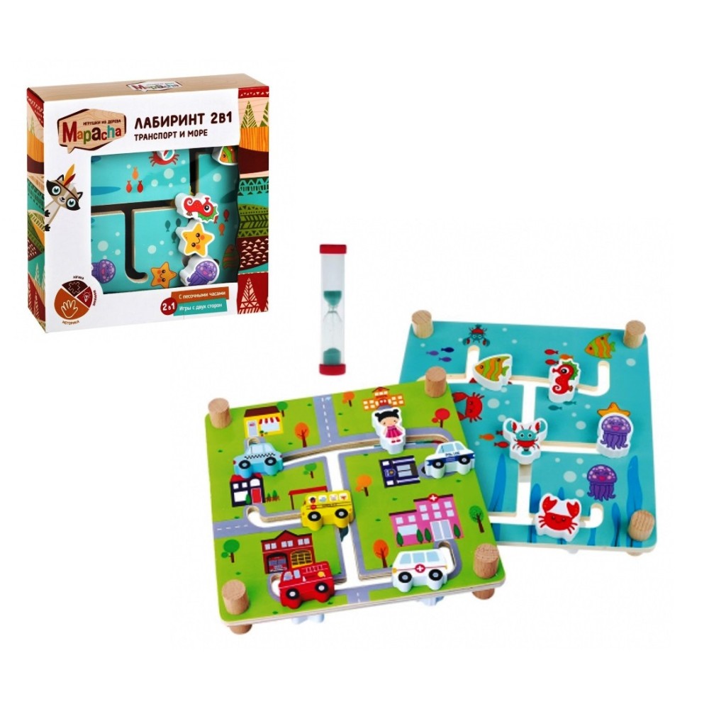 MAPACHA. 76851 Лабиринт двухсторонний 2в1 "Транспорт и море" с песочными часами, 23х5х23 см