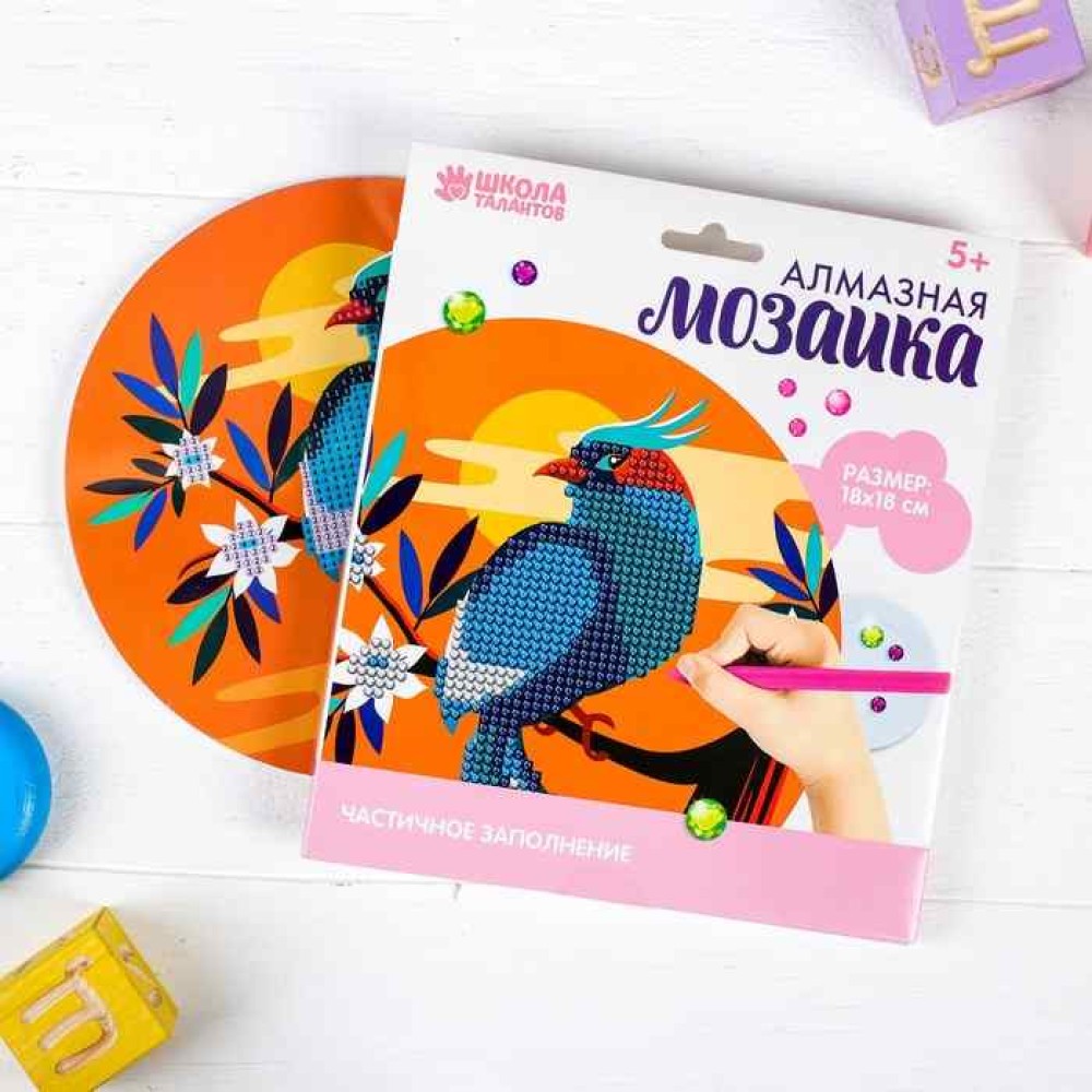 Школа талантов. Алмазная мозаика для детей 18х18 см арт.3659310 "Птичка" емкость, стерж, клеев подуш