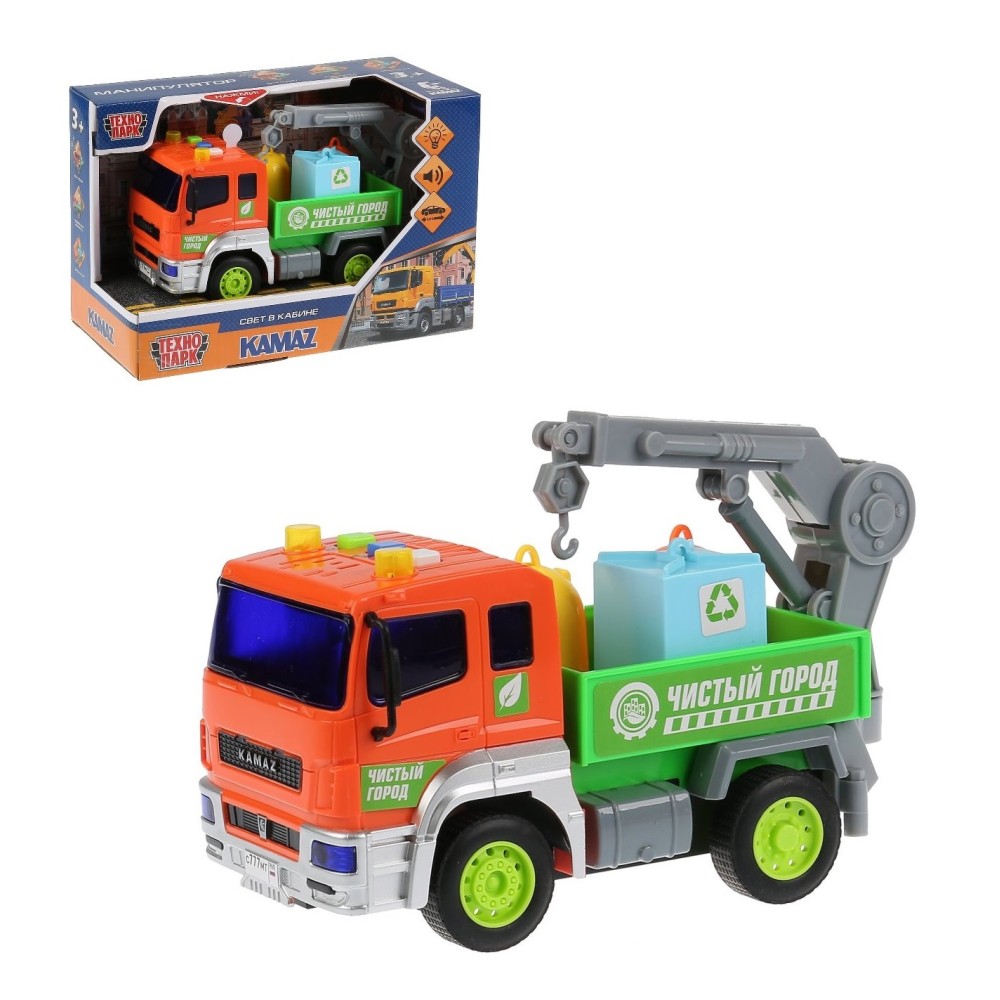 Технопарк. Машина "Kamaz Манипулятор" 28 см, двери, инер, син, пластик свет-звук арт.KAMCRN-28PLCN