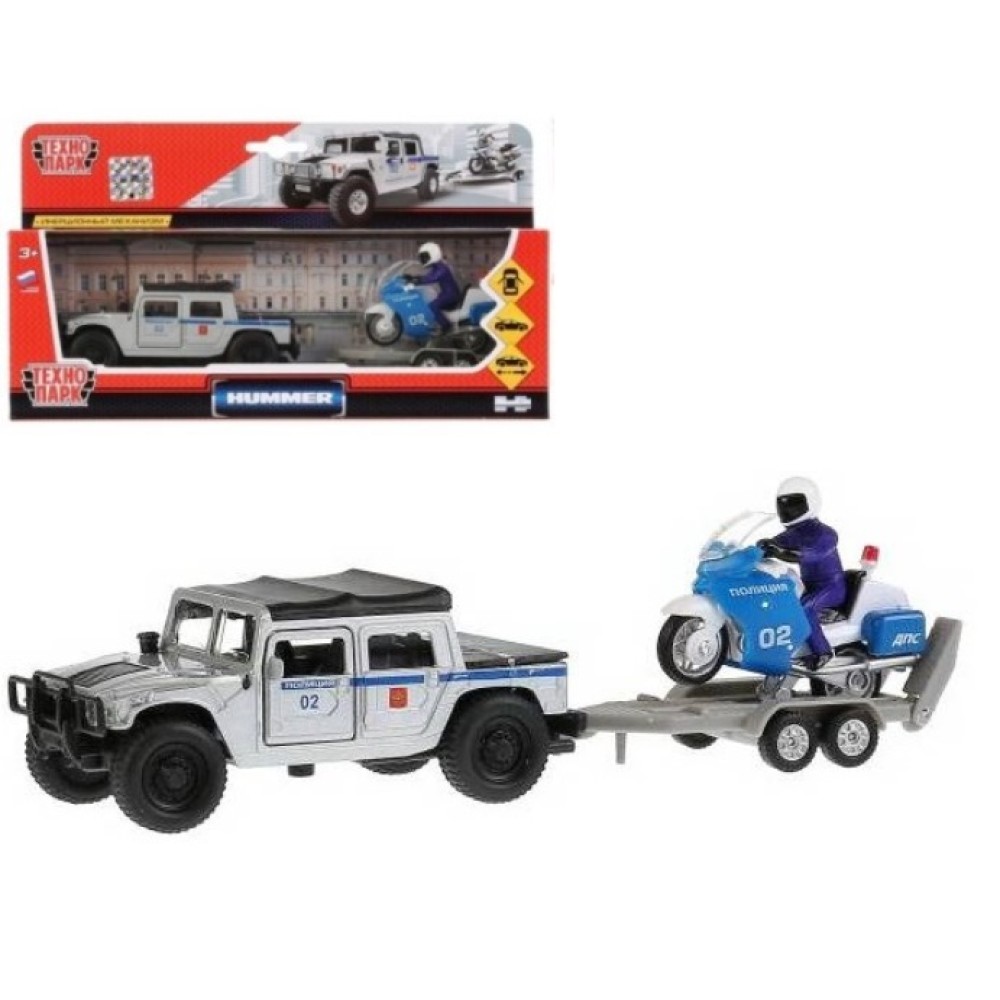 Технопарк. Модель "Hummer H1 Полиция" арт.SB-18-37WB 12см, инерц. + мотоцикл на прицепе в кор.
