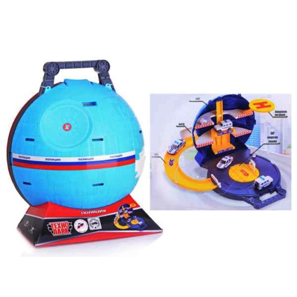 Технопарк. Шар-парковка "Полиция" арт.A129-H06049-R с двумя машинками УАЗ, Лада 7,5 см.