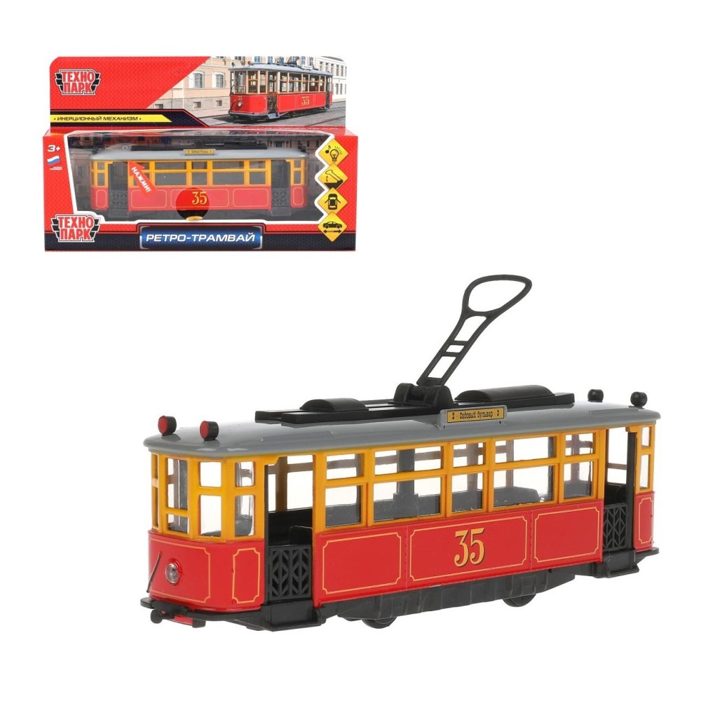 Технопарк. Трамвай ретро 17 см, свет-звук двери, инерц, красн, арт.TRAMMC1-17SL-RD
