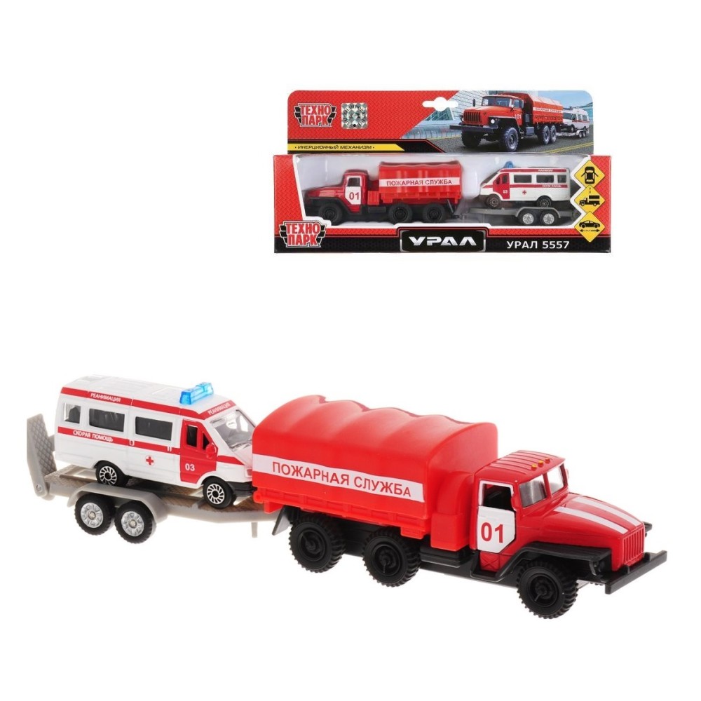 Технопарк. "Урал 5557" арт.SB-16-13WB(GAZEL) Пожарная служба 12см, откр.дв. с приц+маш. 7,5см в