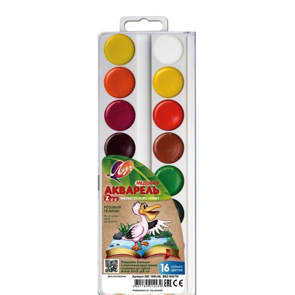 Луч. Акварель "Zoo" 16 цв. б/к, пласт. упак.(европодвес) арт.29С 1693-08 /36