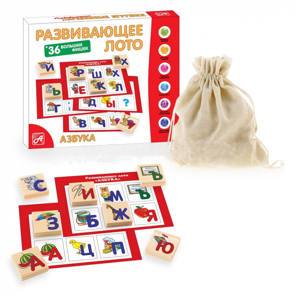 Анданте. Д461а Развивающее лото "Азбука" (36 дер. фишек + 6 карточек + холщ. мешочек)/17