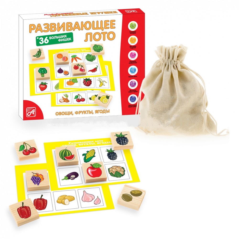 Анданте. Д465а Развивающее лото "Фрукты-овощи" (36 дер. фишек + 6 карточек + холщ. мешочек)