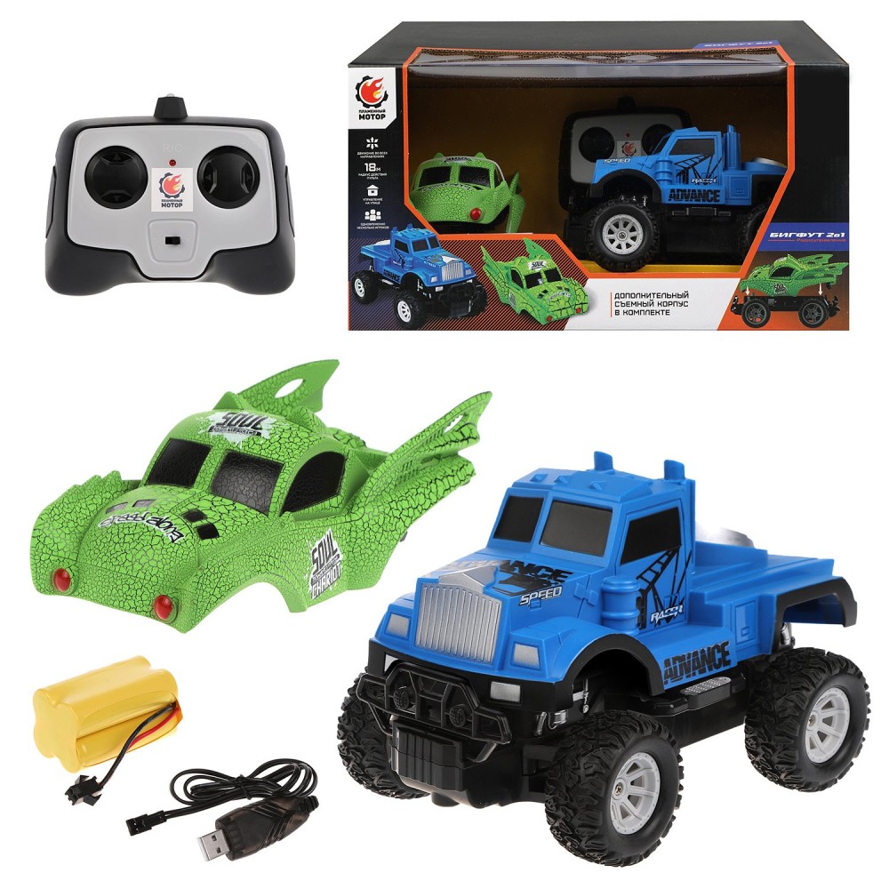 Пламенный мотор. арт.870503 Машина р/у "Бигфут" 2в1 доп.съемный корп в комплекте, аккум., син, зел.