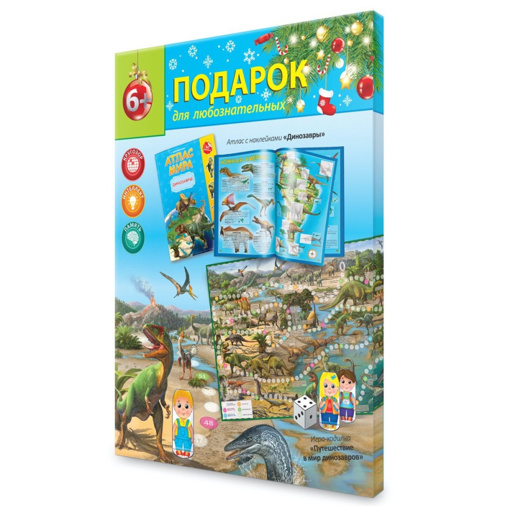 ГеоДом. Подарок для любознательных Новогодний "Динозавры" Атлас с наклейками+Игра-ходилка