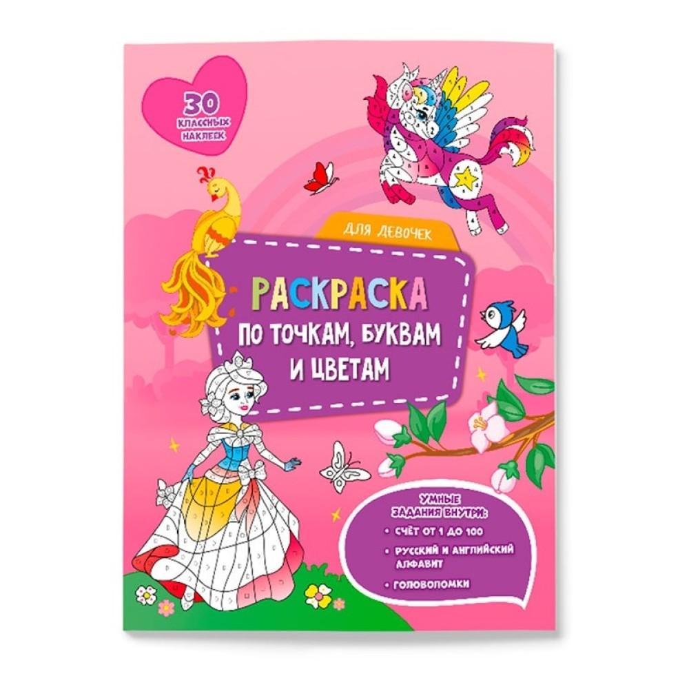 ГеоДом. Раскраска с наклейками по точкам, буквам и цветам. Для девочек. 21х28 см. 26 стр.