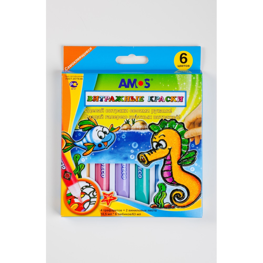 AMOS.18690 Набор витраж.красок "Морской конек/Черепаха" 6 цв., 4 трафарета, 2 винилов. листа /120